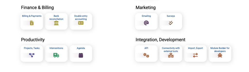 Integration between features and modules is ready-to-use, minimizing the hassles of double entries and enabling immediate functionality for users.