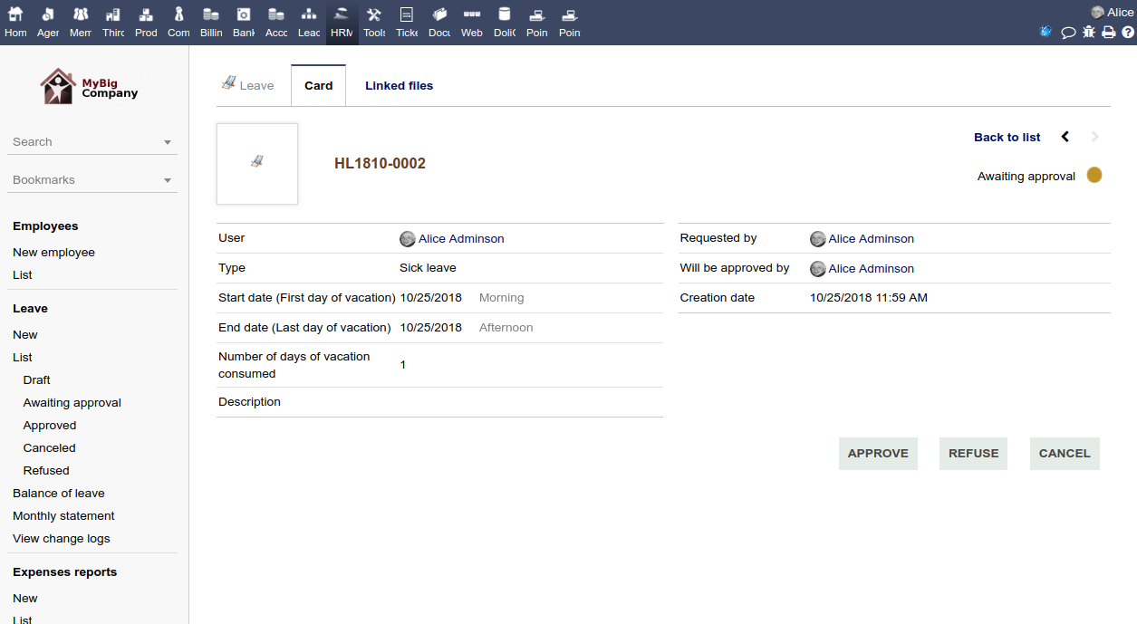 Your employees can make leave requests.Once the leave request is approved, the system automatically decreases the balance.
